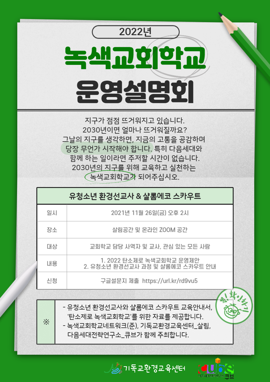 [온라인] 2022 '녹색교회학교' 운영제안 설명회 (유청소년 환경선교사, 샬롬에코스카우트)