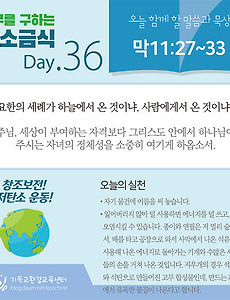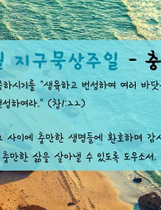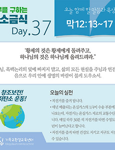 살림의 영성829 6월 첫주일(감리교 둘째주일)은 환경주일입니다. 공동예배자료 공유합니다. 올해 환경주일은 “작은 생명 하나까지도-기후위기시대, 생명다양성을 지키는 교회”입니다. * 아래 '2020년 환경주일 주제 해설' 내용은, 한국기독교교회협의회 생명문화위원회와 기독교환경운동연대가 펴낸 '2020년 환경주일공동예배 자료'에서 옮겨왔습니다. * 환경주일 공동예배자료 : 작은 생명 하나까지도 - 기후위기시대, 생명다양성을 지키는 교회 올해 환경주일 주제는 ‘작은 생명 하나까지도 - 기후위기시대, 생명다양성을 지키는 교회’입니다. 제 37회를 맞이하는 이번 환경주일은 그리스도인들에게 하나님이 한 처음 창조하신 이 세계와 그 안에서 살아가는 생명을 지켜내는 것이 가장 중요한 소명임을 기억하는 주일입니다. 특별히 최근 더 이상 방치할 수가 없는 위기상황이 되어버린 있는 기후변화에 대한 대응뿐만 아니.. 2020. 5. 27. [5월] "크리스찬 어스아워(Christian Earth Hour)"로 살림합시다. 한 달에 한 번, 지구묵상주일을 지키며 크리스찬어스아워(Christian Earth Hour)를 가져봅시다. 크리스찬 어스아워는 매월 마지막주 금요일 8시부터 15분으로 정하였는데, 지구를 위해 침묵으로 기도하고 실천을 점검할 것을 제안합니다. 매월 초에는 지구묵상주일 이미지(2019년 제작)와 주제 성구, 기도문을 제공하고, 관련 뉴스 기사&글&캠페인 등을 통한 실제 현황을 살펴보게 하여, 구체적인 적용 방법을 찾아 실천하게 해드릴 것입니다. 피조세계와의 교감은 창조주 하나님의 사랑과 주님의 고난과 피조물들의 고통을 느끼게 합니다. 이 때, 우리 안에는 지구의 회복을 위한 일상의 변화를 만들 수 있는 힘이 생겨나고, 우리가 만들어낸 삶의 변화는 정의롭고 지속가능한 사회로의 전환을 이뤄냅니다. 앞으로 함.. 2020. 4. 22. Happy Easter! 지구이웃과 함께 하는 <기쁨의 50일> 주간 실천 Happy Easter! 주님 부활하심을 함께 기뻐합니다.부활하신 주님이 나에게 말을 걸어오실 때에,"주님! 생명을 얻고 또 얻게 하셨으니,모두가 골고루 풍성한 삶을 누리기까지 교육하고 실천하겠다"고 대답하겠습니다. #지구이웃 과 함께하는 #기쁨의50일 주간 실천카드,영상http://pf.kakao.com/_rmExdC.. 2020. 4. 16. 크리스찬 어스아워(Christian Earth Hour) - 4월 캠페인 (2) "크리스찬 어스아워, Christian EarthHour", 4월 두번째 캠페인은 지구의 날(4월 22일) 관련 실천입니다. 실천 카드뉴스를 활용하셔서~ 지구의 날 전후 1주일(4월20일-4월26일) 동안 지구를 기억하며 함께 행동합시다. #살림 #살림신앙캠페인 #크리스찬어스아워 #지구의날 #7DayChallenge 2020. 4. 13. 40일의 탄소금식-40일(4/11) 40일의 탄소금식-40일(4/11) 인간이 무심히 일회용품을 쓰고 버리며 에너지를 낭비하는 동안 지구온난화로 인한 기후변화가 지금도 많은 생명을 죽음으로 몰아가고 있습니다. 호주에서 5개월이 넘도록 이어졌던 대형 산불도, 이번 코로나 19 바이러스도 각각 분리된 일이 아닙니다. 인간이 .. 2020. 4. 10. 40일의 탄소금식-39일(4/10) 40일의 탄소금식-39일(4/10) 인간이 무심히 일회용품을 쓰고 버리며 에너지를 낭비하는 동안 지구온난화로 인한 기후변화가 지금도 많은 생명을 죽음으로 몰아가고 있습니다. 호주에서 5개월이 넘도록 이어졌던 대형 산불도, 이번 코로나 19 바이러스도 각각 분리된 일이 아닙니다. 인간이 .. 2020. 4. 9. 40일의 탄소금식-38일(4/9) 40일의 탄소금식-38일(4/9) 인간이 무심히 일회용품을 쓰고 버리며 에너지를 낭비하는 동안 지구온난화로 인한 기후변화가 지금도 많은 생명을 죽음으로 몰아가고 있습니다. 호주에서 5개월이 넘도록 이어졌던 대형 산불도, 이번 코로나 19 바이러스도 각각 분리된 일이 아닙니다. 인간이 만.. 2020. 4. 8. 40일의 탄소금식-37일(4/8) 40일의 탄소금식-37일(4/8) 인간이 무심히 일회용품을 쓰고 버리며 에너지를 낭비하는 동안 지구온난화로 인한 기후변화가 지금도 많은 생명을 죽음으로 몰아가고 있습니다. 호주에서 5개월이 넘도록 이어졌던 대형 산불도, 이번 코로나 19 바이러스도 각각 분리된 일이 아닙니다. 인간이 만.. 2020. 4. 7. 40일의 탄소금식-36일(4/7) 40일의 탄소금식-36일(4/7) 인간이 무심히 일회용품을 쓰고 버리며 에너지를 낭비하는 동안 지구온난화로 인한 기후변화가 지금도 많은 생명을 죽음으로 몰아가고 있습니다. 호주에서 5개월이 넘도록 이어졌던 대형 산불도, 이번 코로나 19 바이러스도 각각 분리된 일이 아닙니다. 인간이 만.. 2020. 4. 6. 이전 1 ··· 71 72 73 74 75 76 77 ··· 93 다음