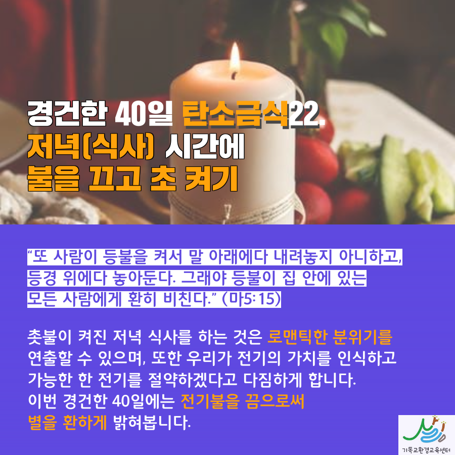 | 경건한 40일 탄소금식21. 전기를 쓰지 않는 날을 정하고 실천하기 (0) | 2022.03.25 |