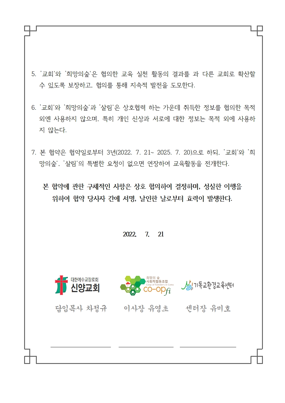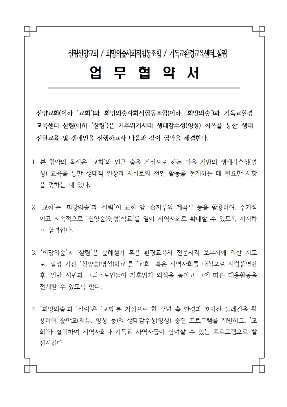 신양교회(이하 ‘교회’)와 희망의숲사회적협동조합(이하 ‘희망의숲’)과 기독교환경교육센터_살림(이하 ‘살림’)은