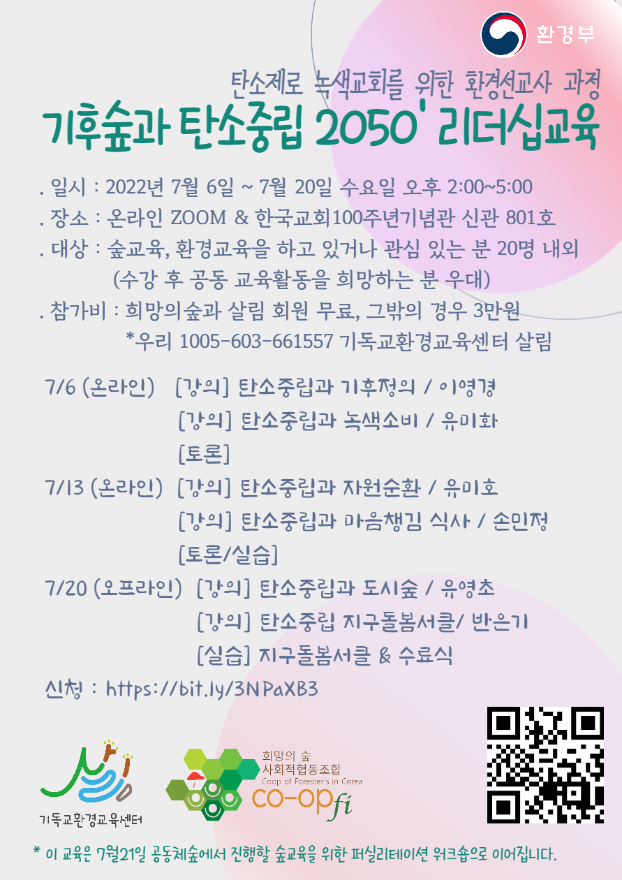 '기후숲과 탄소중립 2050'을 위한 리더십교육 .일시 : 2022년 7월 6일 ~ 7월 20일 수 오후 2:00~5:00 .장소 : 온라인 ZOOM & 한국교회100주년기념관 신관 801호 .대상 : 숲교육, 환경교육을 하고 있거나 관심