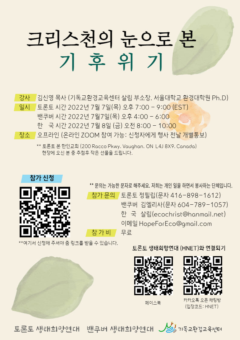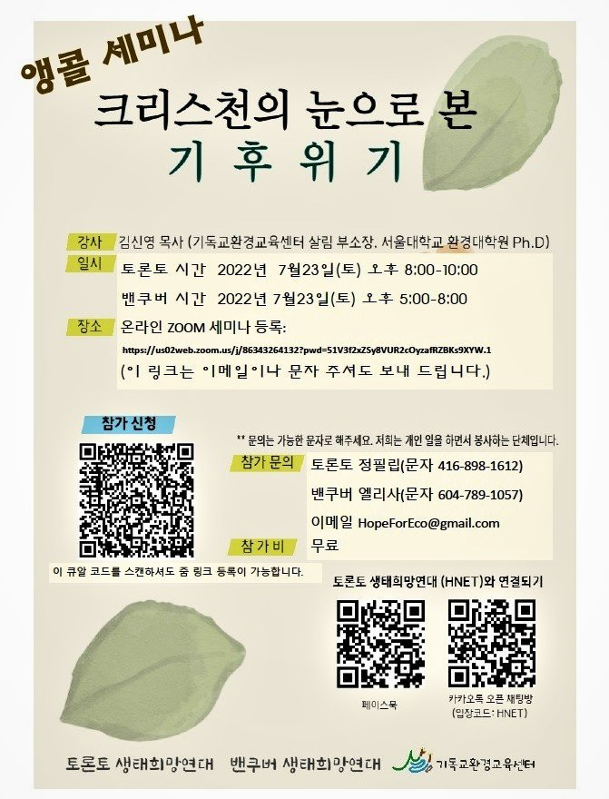 세 곳이 함께 열었던 '크리스천의 눈으로 본 기후위기' 세미나가 지난 7월 7일에 본 한인교회와 온라인 줌 공간에서 개최된 후 7월 23일 앵콜세미나까지 개최하는 등 잘 마무리되었습니다.
