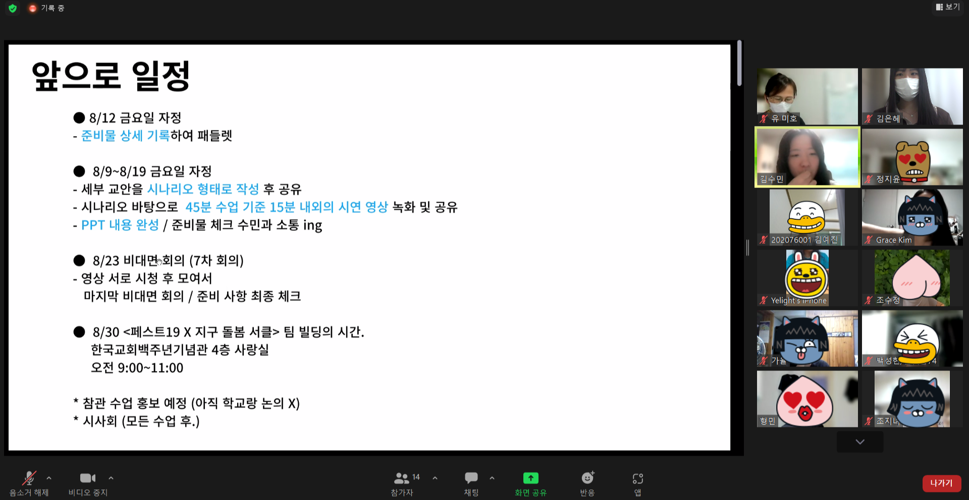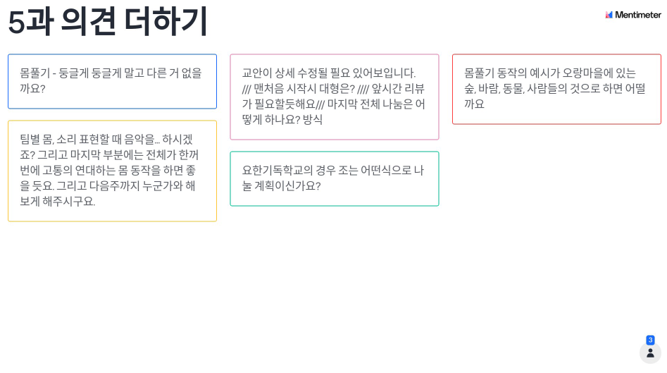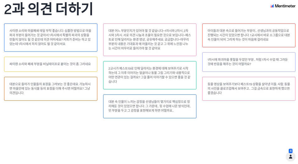 지난 8월 9일 오전 9시부터 10시 30분까지 “결말 없는 페스트19” 제6차 회의가 진행되었습니다. 교사들과 함께 교안을 공유하며 궁금한 부분들을 각 차시 수업별로 멘티미터를 활용해 서로 의견을 나누는 시간을 가졌습니다.