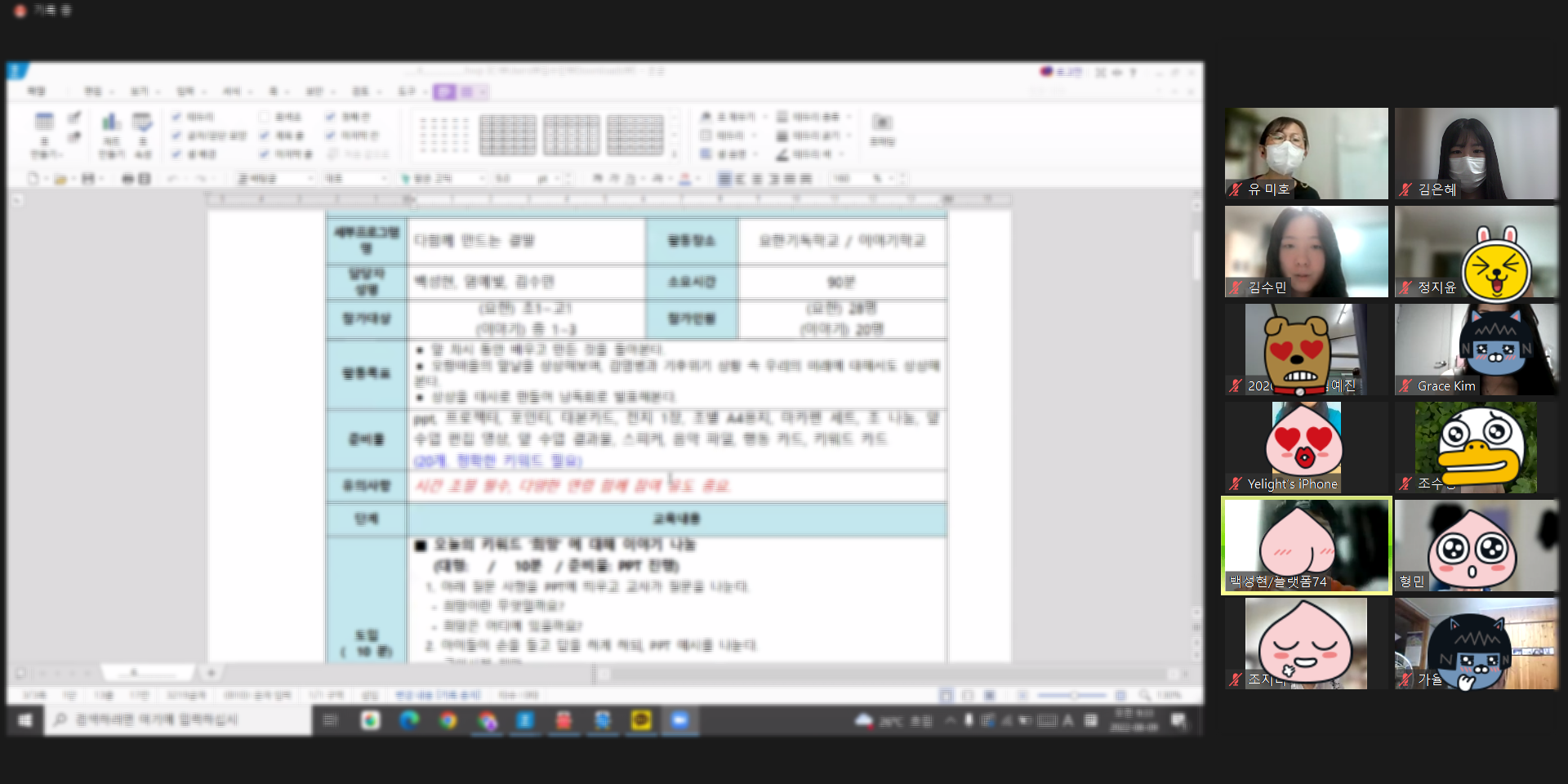 이날 회의에는 각 차시별 교사로 1차시 인문+환경 팀의 남가율, 조지녀 선생님, 2차시 미술 팀의 조수정, 정지윤 선생님, 3사치 음악-힙합 팀의 박형민 선생님, 4차시 음악-합창 팀의 김예진 선생님, 5차시 동작 팀의 김하은, 백성현 선생님, 6차시 연극 팀의 백성현, 염예빛 선생님과 더불어,