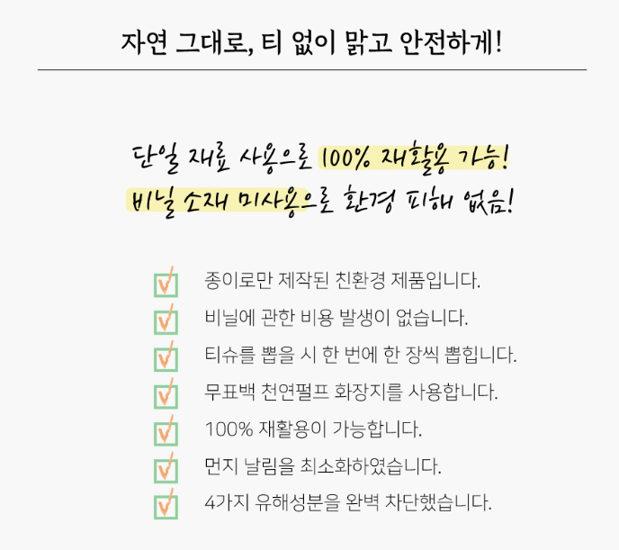 티슈의 출구 부분의 비닐부속품 쓰레기가 발생하지 않는 친환경 각티슈를 소개합니다.