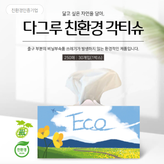 2021년 3월 '다그루 친환경 각티슈'는 무색&무향 화장지, 무형광 천연펄프 원단, 환경보호 정책에 따른 순수천연 펄프 사용으로 환경표지 인증을 받아, 아래와 같이 '다그루 친환경 각티슈'로 보급되고 있습니다. 코로나 이후 특히 친환경에 많은 사람들이 관심을 가지고 있습니다. 하지만 말만 그럴싸하게 친환경이라 하고 생산 제조공정, 판매과정, 리사이클링 측면에서 친환경이라 말할 수 없는 '그린워싱'을 조심해야 합니다.