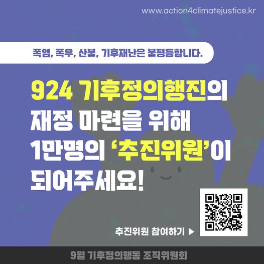 기후위기의 심각성을 인지하고, 기후정의를 가치로 모두가 평등하고 존엄한 삶을 살아 갈수 있는 세상을 만들자는 뜻을 모아 함께 하고 있는 행동입니다. 오는 9월24일에, 924기후정의행진을 하는데, 재정마련을 위한 1만명의 ‘추진위원’을 모으네요. 나와 내 자손을 위한 생명 선택으로 관심과 참여를 기대합니다~*