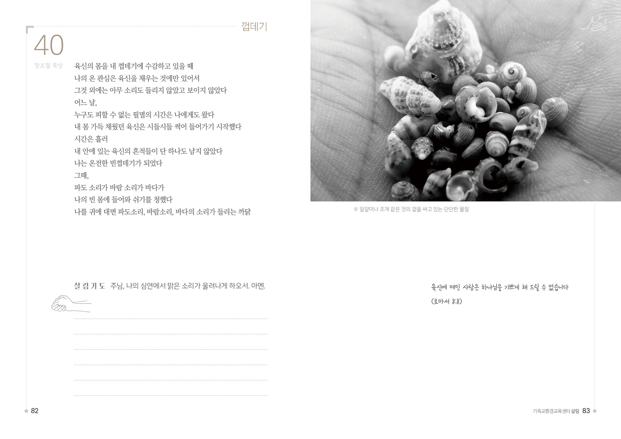 창조절* 동안 하루에 한 가지씩 총 40가지의 글과 사진을 제공합니다. 묵상카드의 성경 구절은 새번역성경을 사용했으며 본문에 인용된 문장들은 맞춤법까지 원문을 그대로 사용했습니다.