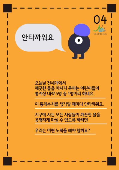 우리에게 생명의 물을 선물해주신 하나님, 우리가 물을 마실 때마다, 물을 사용할 때마다 이 물을 충분히 마시지 못하고 마음껏 쓰지 못하는 사람들을 기억하게 하소서. |