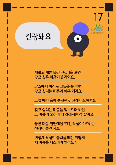 1. 카드 앞면을 읽으면서 자신의 “마음(감정의 머무름, 움직임)”을 살피되, 카드에 적힌 내용과 조금 다른 마음이 얼마든지 일어날 수 있으니, 그 마음 또한 ‘정직하게 그대로’ 느끼기 => 서클로 앉아서 차례대로 대화!