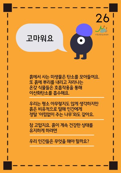 하나님, 우리가 늘 발로 밟고 다니는 흙이 지구 전체에 깃든 생명의 순환에 얼마나 크게 기여하는가, 생각해봅니다. 만약 흙이 없다면 우리는 어떻게 될까, 생각해봅니다. 하나님, 감사합니다. |