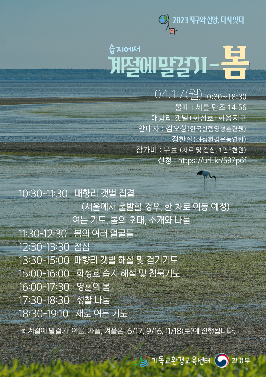 2023년 4월 17일(월) 10:30~18:30 물때 : 세물 만조 14:56 매향리 갯벌+화성호+화용지구 안내자 : 김오성(한국샬렘영성훈련원) 정한철(화성환경운동연합) 참가비 : 무료 (자료 및 점심, 1만5천원) 10:30~11:30