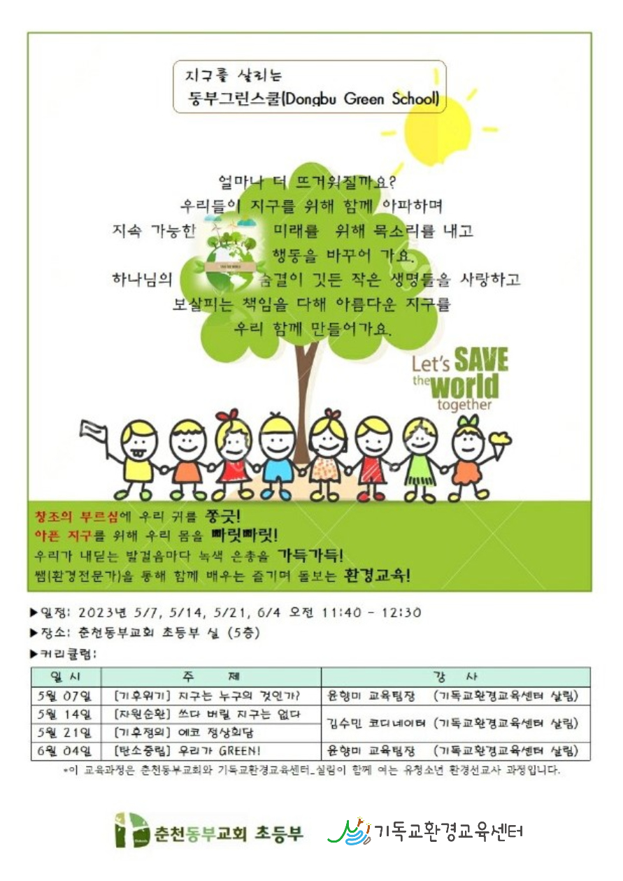 춘천동부교회초등부 '동부그린스쿨'이 살림과 함께 유청소년 환경선교사 과정으로 진행중에 있습니다