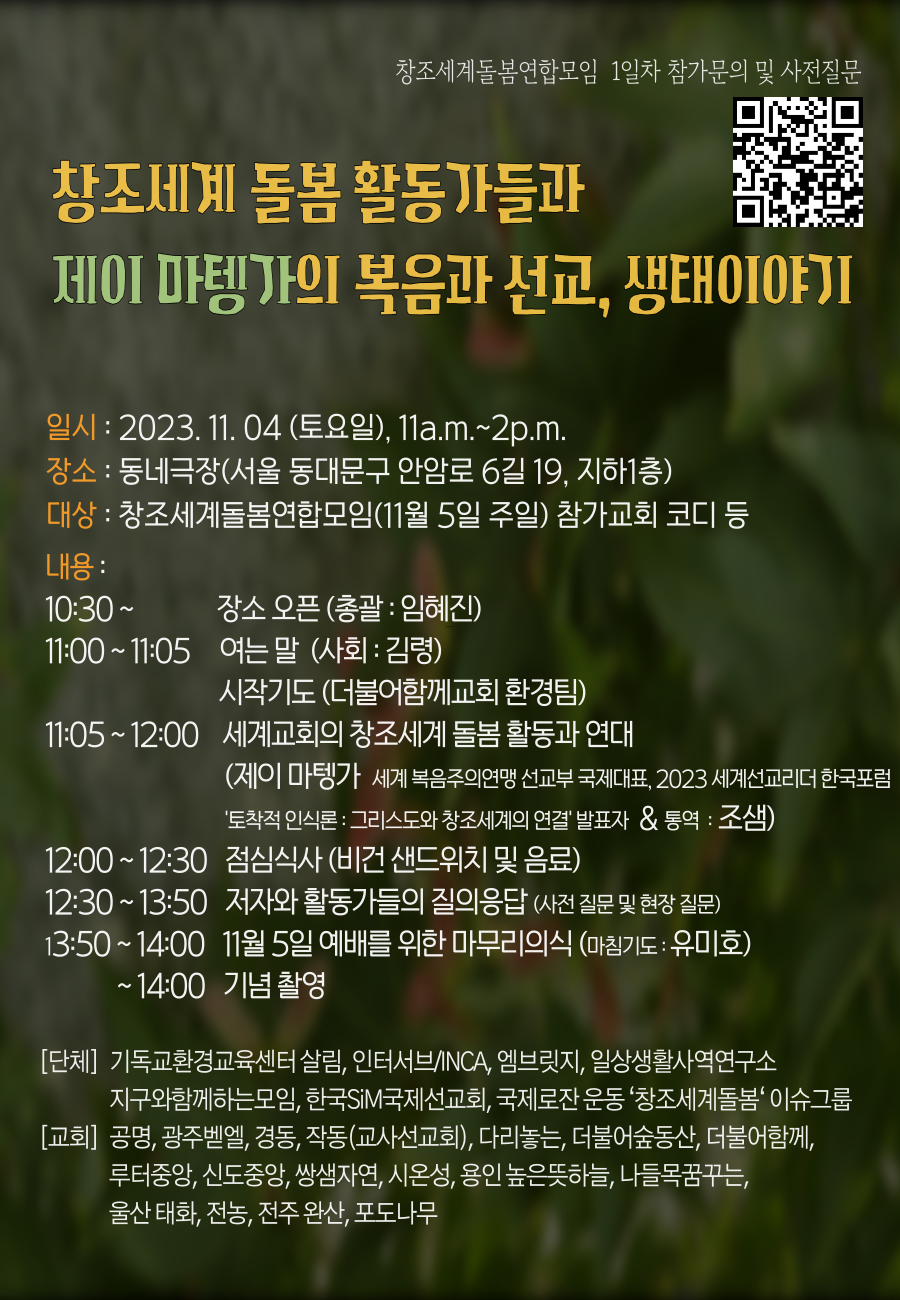 아무쪼록 이번 모임에서 나누어지는 16개 교회의 창조세계 돌봄 이야기, 그리고 선교학자이자 뉴질랜드 마오리 족으로서 뉴질랜드 복음주의 선교단체의 전체 연합체를 이끌어가고 있는 마텡가 박사의 이야기를 통해, 우리 모두가 ‘땅과 복음, 그리고 그리스도가 어떻게 연결되는지’ 깊이 성찰하고 함께 창조세계를 회복해가게 되길 소망합니다.