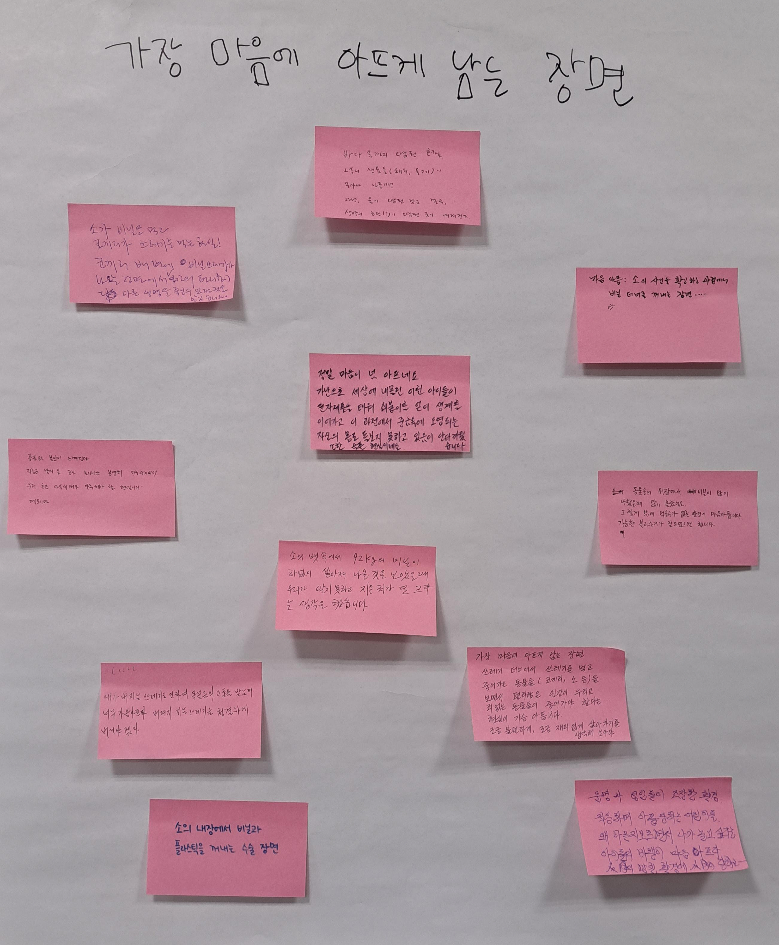 기억에 남는 슬픈 장면에 대한 포스트잇 활동을 진행했습니다.