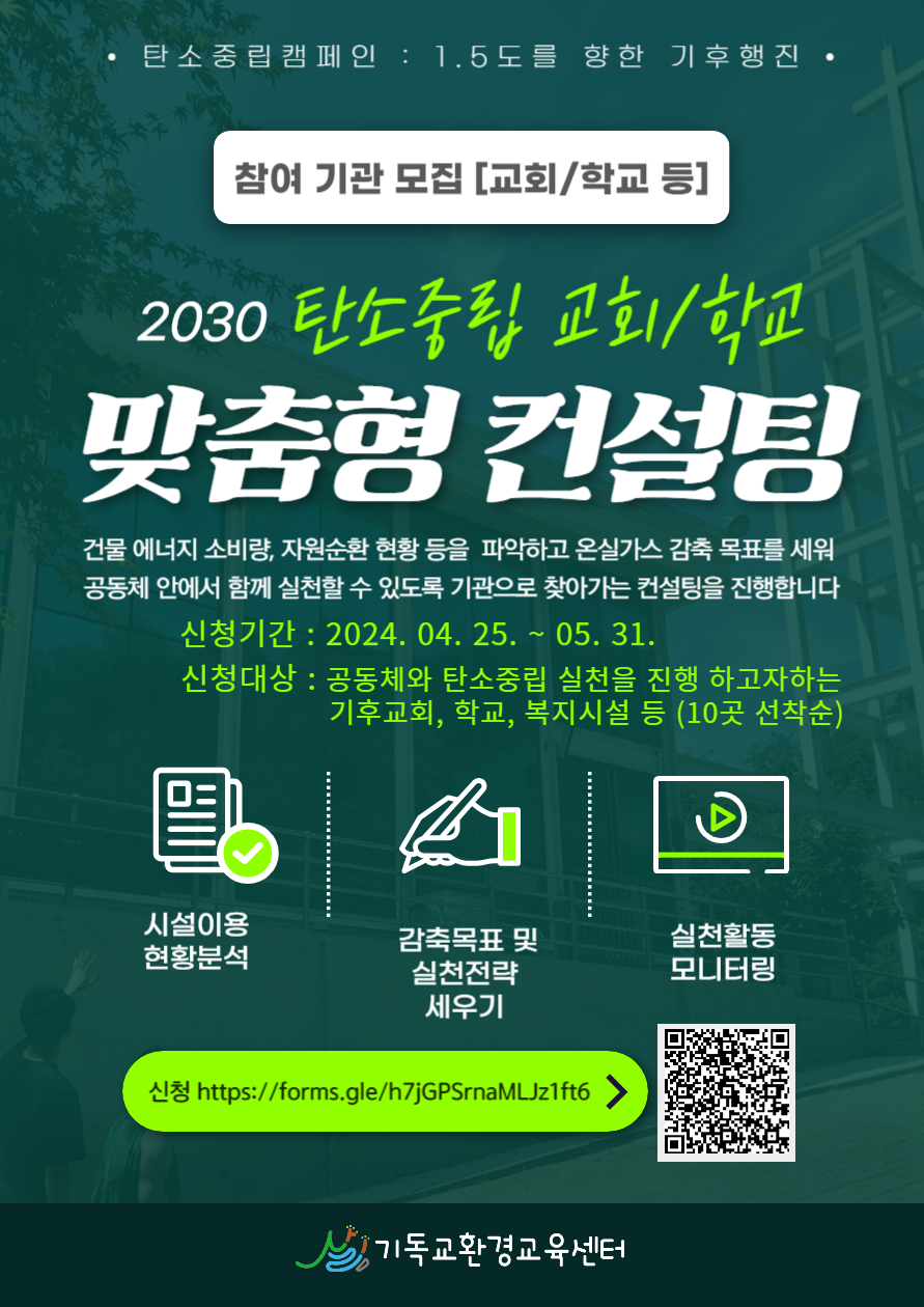 | 탄소중립을 위한 맞춤형 컨설팅 참여기관 [기후교회/ 학교 등] 모집 (0) | 2024.04.25 |