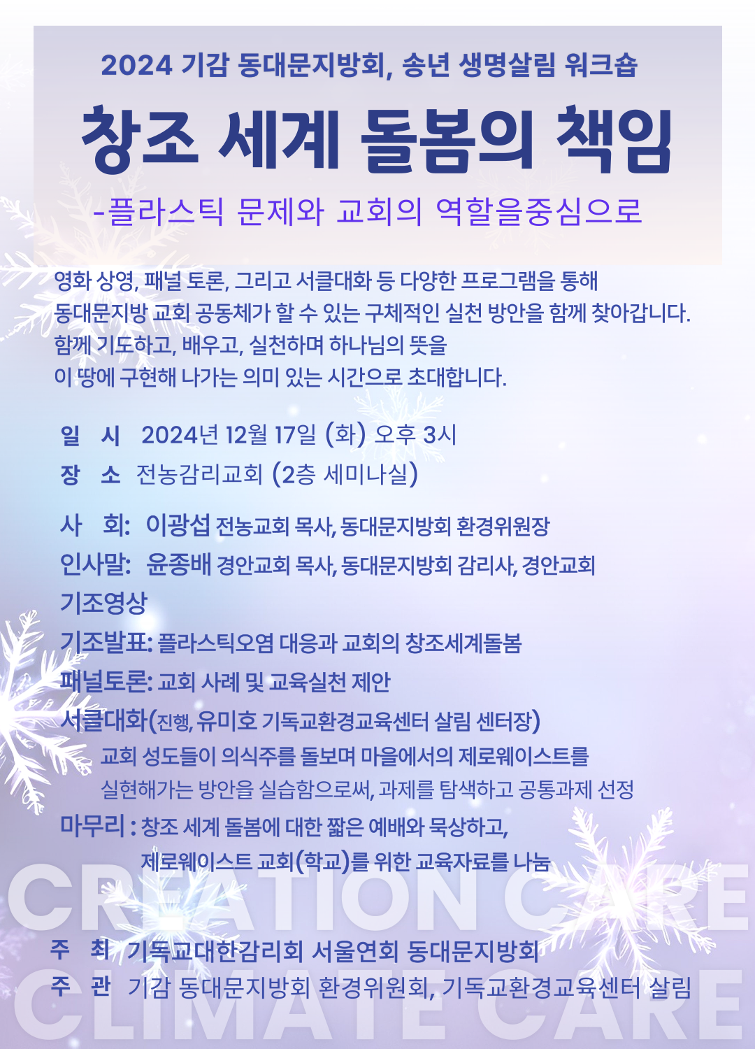 | 2024 송년워크숍, "창조세계돌봄의 책임; 플라스틱 문제와 교회의 역할" - 동대문지방회 환경위원회&기독교환경교육센터_살림 (1) | 2024.12.20 |