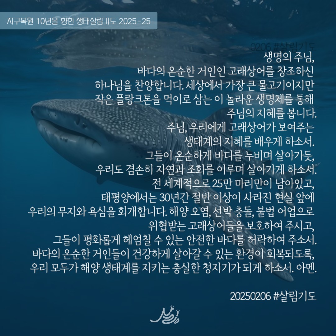바다의 온순한 거인들이 건강하게 살아갈 수 있는 환경이 회복되도록, 우리 모두가 해양 생태계를 지키는 충실한 청지기가 되게 하소서. 아멘.