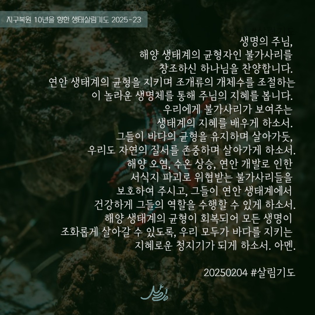 해양 생태계의 균형이 회복되어 모든 생명이 조화롭게 살아갈 수 있도록, 우리 모두가 바다를 지키는 지혜로운 청지기가 되게 하소서. 아멘.