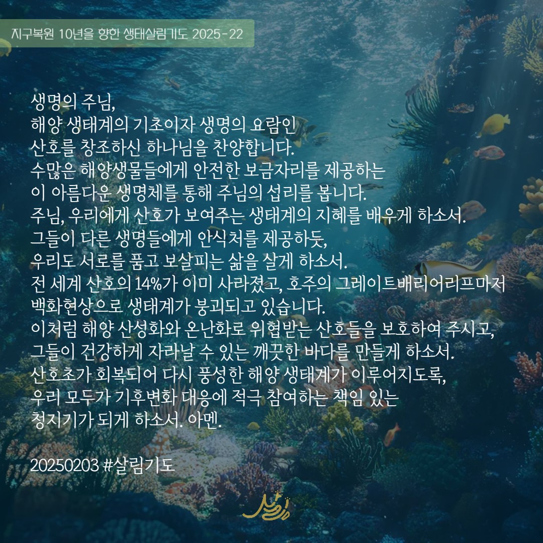 산호초가 회복되어 다시 풍성한 해양 생태계가 이루어지도록, 우리 모두가 기후변화 대응에 적극적으로 참여하는 책임 있는 청지기가 되게 하소서. 아멘.