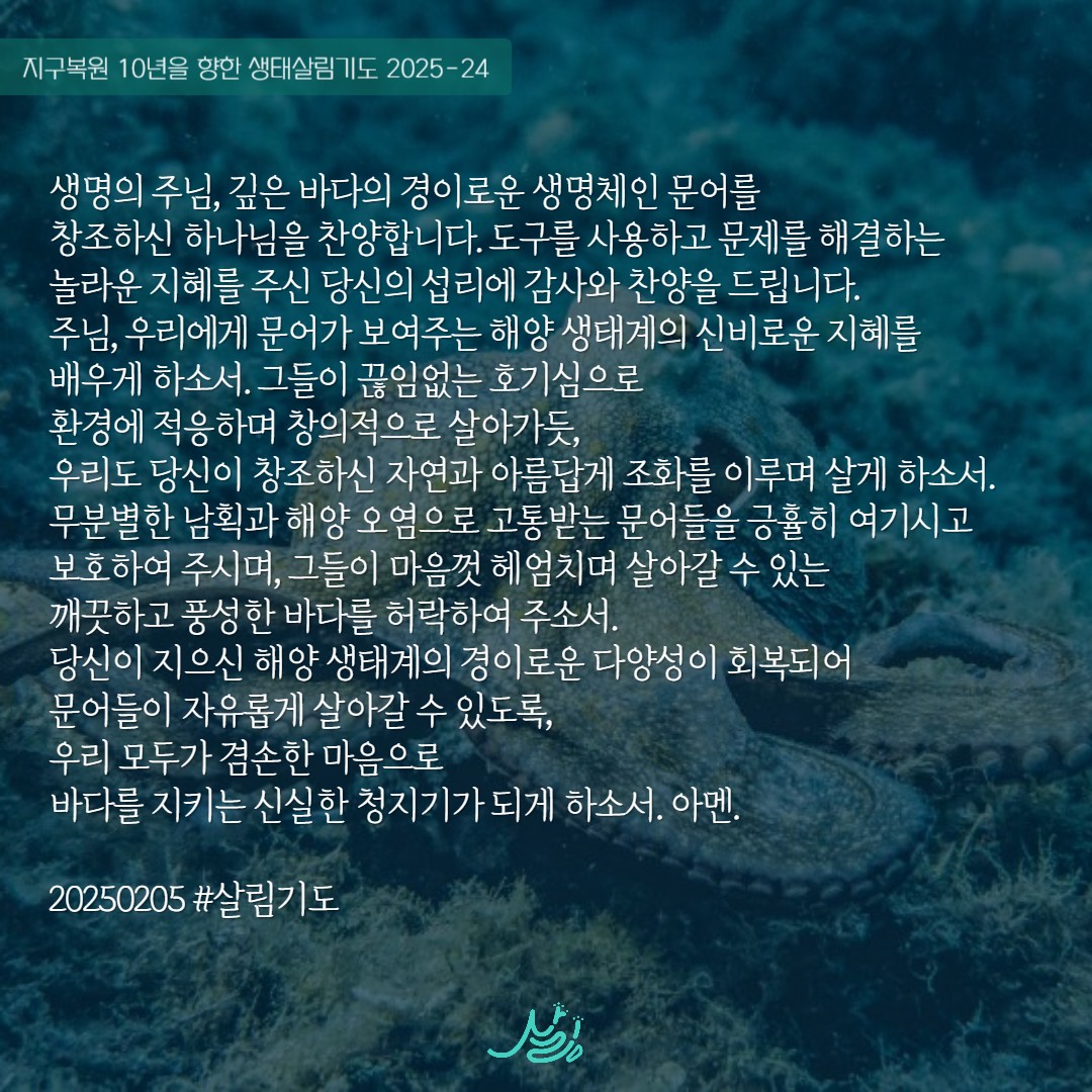 당신이 지으신 해양 생태계의 경이로운 다양성이 회복되어 문어들이 자유롭게 살아갈 수 있도록, 우리 모두가 겸손한 마음으로 바다를 지키는 신실한 청지기가 되게 하소서. 아멘.