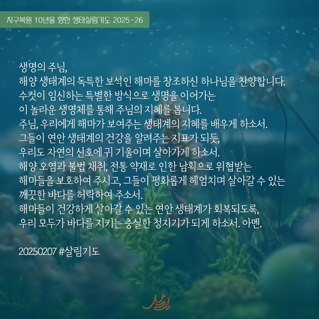 해마들이 건강하게 살아갈 수 있는 연안 생태계가 회복되도록, 우리 모두가 바다를 지키는 충실한 청지기가 되게 하소서. 아멘.