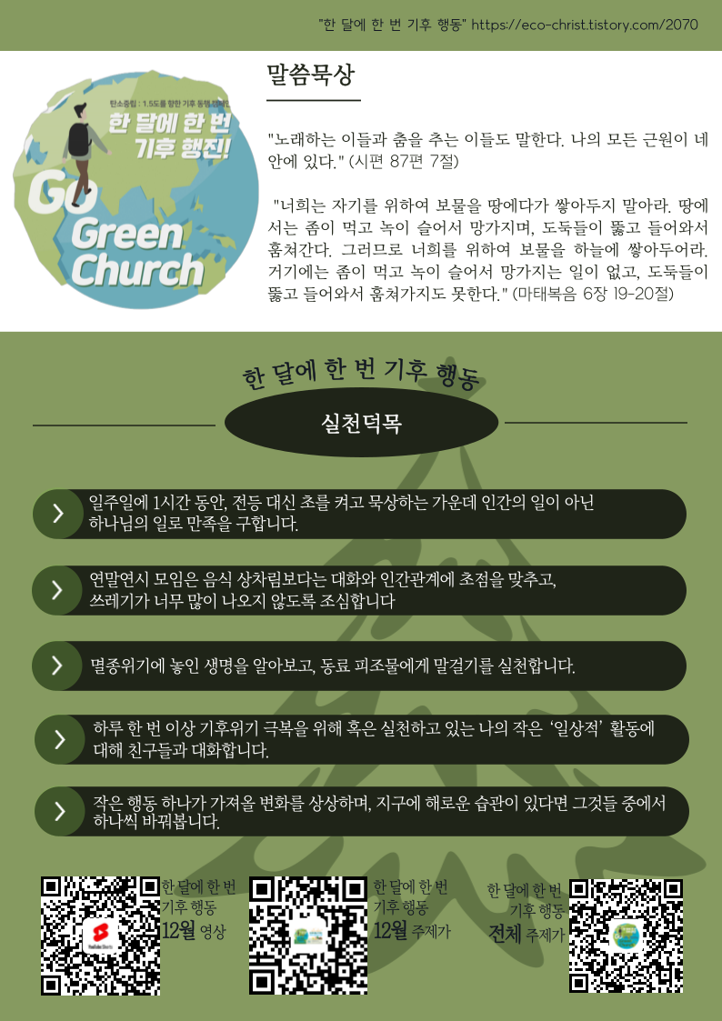 2025년 “한 달에 한 번, 기후 행동” 캠페인교회가 하나님의 창조 세계를 돌보고 기후위기에 적극적으로 대응하기 위해 시작하는 '한 달에 한 번 기후 동행' 캠페인을 소개합니다. 이 캠페인은