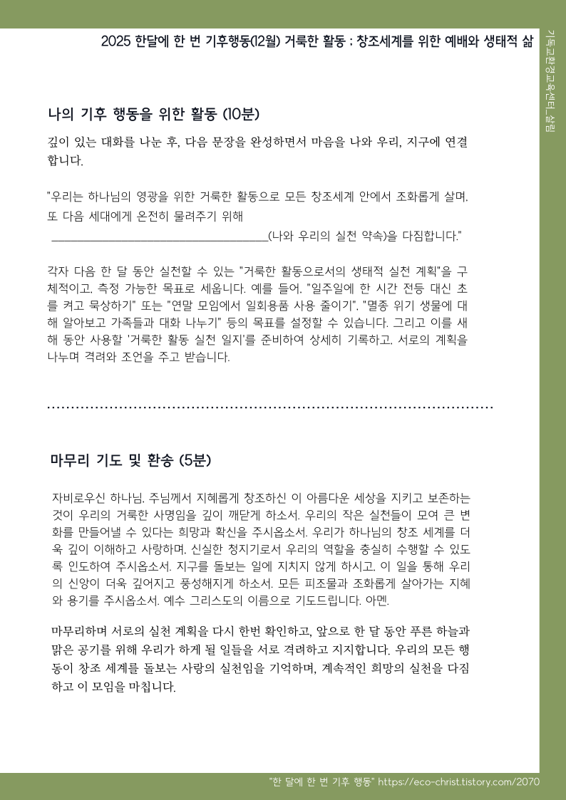 2025년 “한 달에 한 번, 기후 행동” 캠페인 - 월별 주제, 영상, 노래, 소그룹나눔 자료 공유