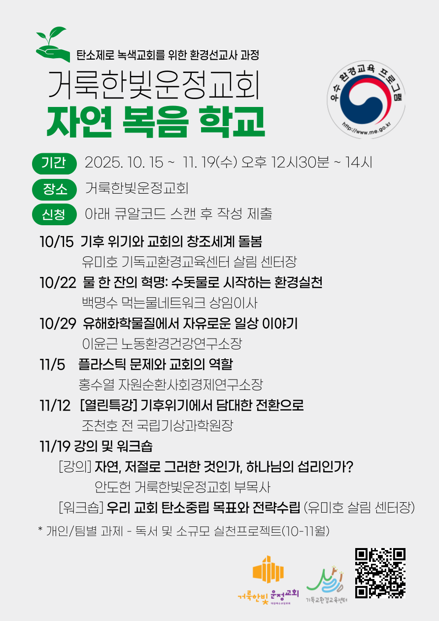 일시: 25년 10월 15일-11/12일 수 오후 12시30분 - 14시 (12시, 교회 식당에서 식사) 장소: 거룩한빛운정교회 신청: https://forms.gle/SzHFRdkx3xoK5bnC8 내용: 10/15 기후 위기와 교회의 창조세계 돌봄 / 유미호 기