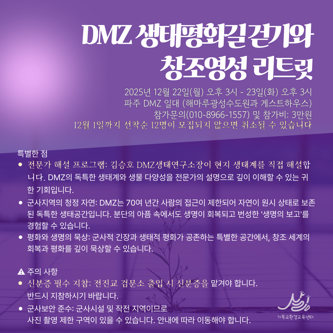 - 평화와 생명의 묵상: 군사적 긴장과 생태적 평화가 공존하는 특별한 공간에서, 창조 세계의 회복과 평화를 깊이 묵상할 수 있습니다.