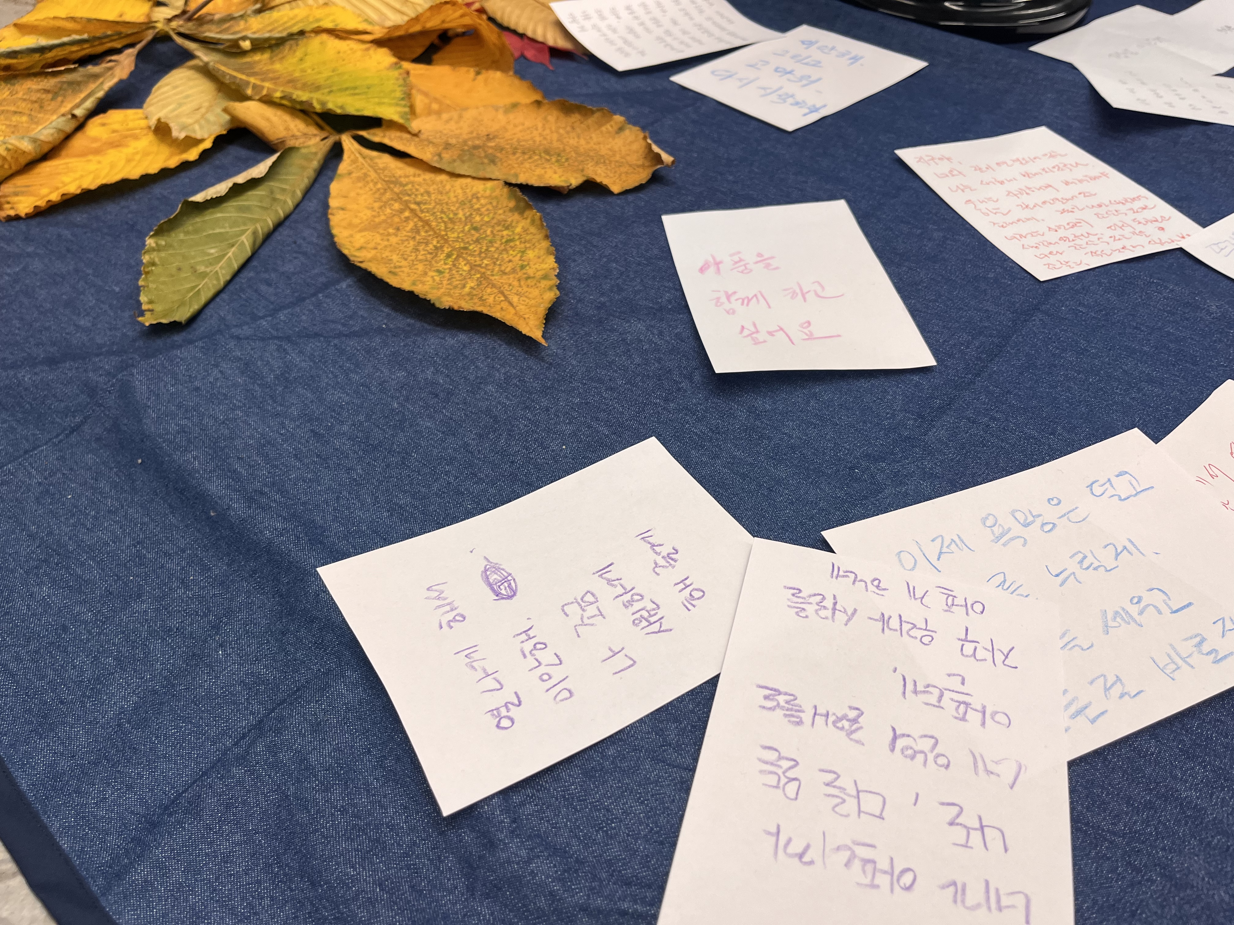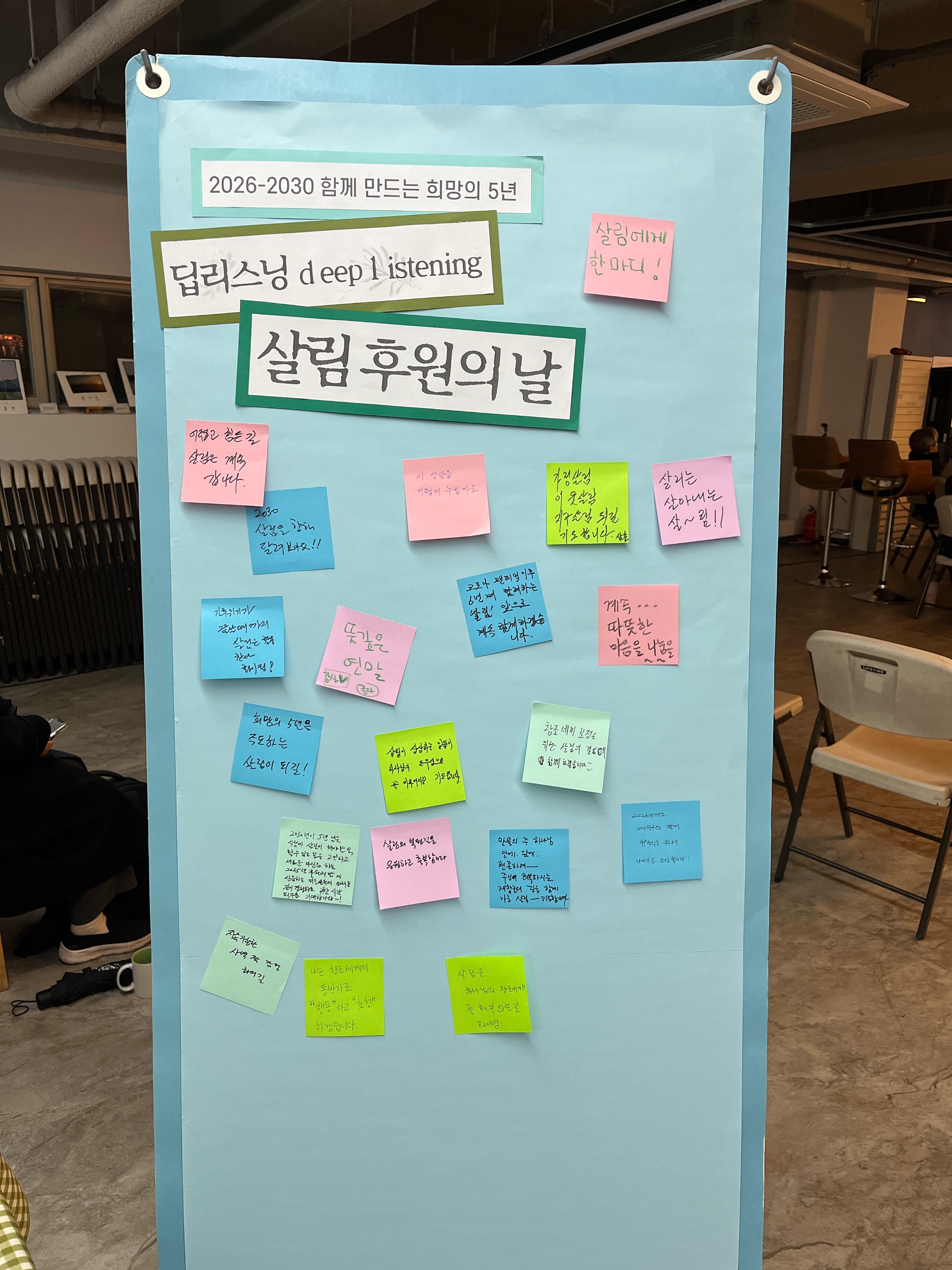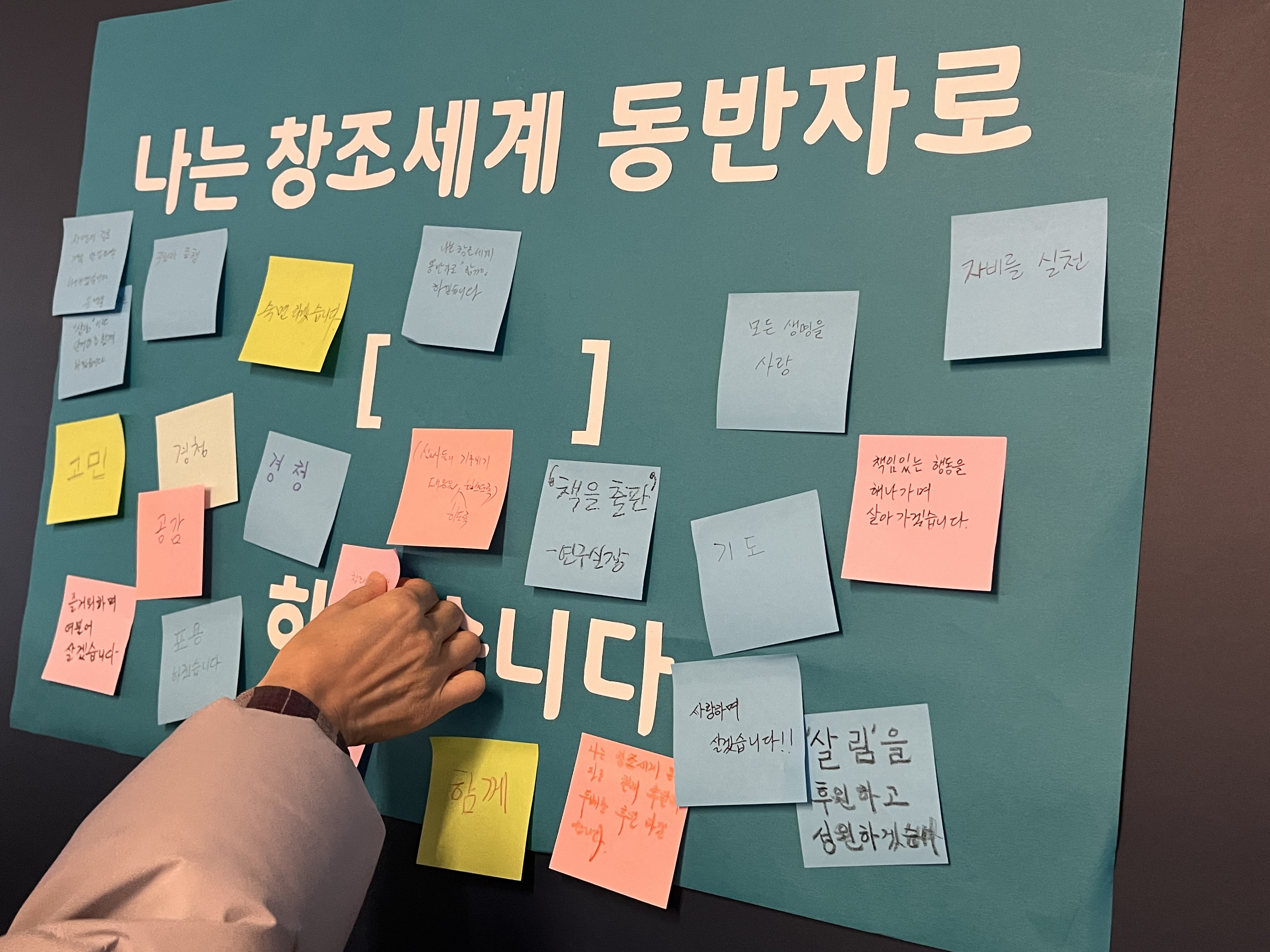 이어서 자연의 소리—빗소리, 새소리—가 홀 안을 채웠다. 유 센터장이 조용히 물었다. "평소 이 소리를 얼마나 자주 들었나요? 이 소리가 사라진다면 우리 삶은 어떻게 달라질까요?" 각자가 생각하는 책임의 언어를 찾도록 안내했다. 참가자들은 잠시 생각에 잠겼다가, 무대 옆에 마련된 연결의 벽으로 향했다. "나는 창조세계 동반자로 _______________ 하겠습니다"라는 글귀의 빈칸을 포스트잇으로 채워 넣었다. "나는 창조세계의 동반자로서 일회용품 사용 줄이기를 하겠습니다." "나는 창조세계의 동반자로서 자연의 소리에 귀 기울이기를 하겠습니다." 각자의 다짐이 벽을 채워갔다. 기후위기, 교회 공동체의 무관심, 개인적인 무력감... 각자가 마주한 '어둠'은 달랐지만, 그 어둠을 직시하고 빛을 찾으려는 마음은 같았다. 책임 있는 존재로 살아가겠다는 다짐도 마찬가지였다.