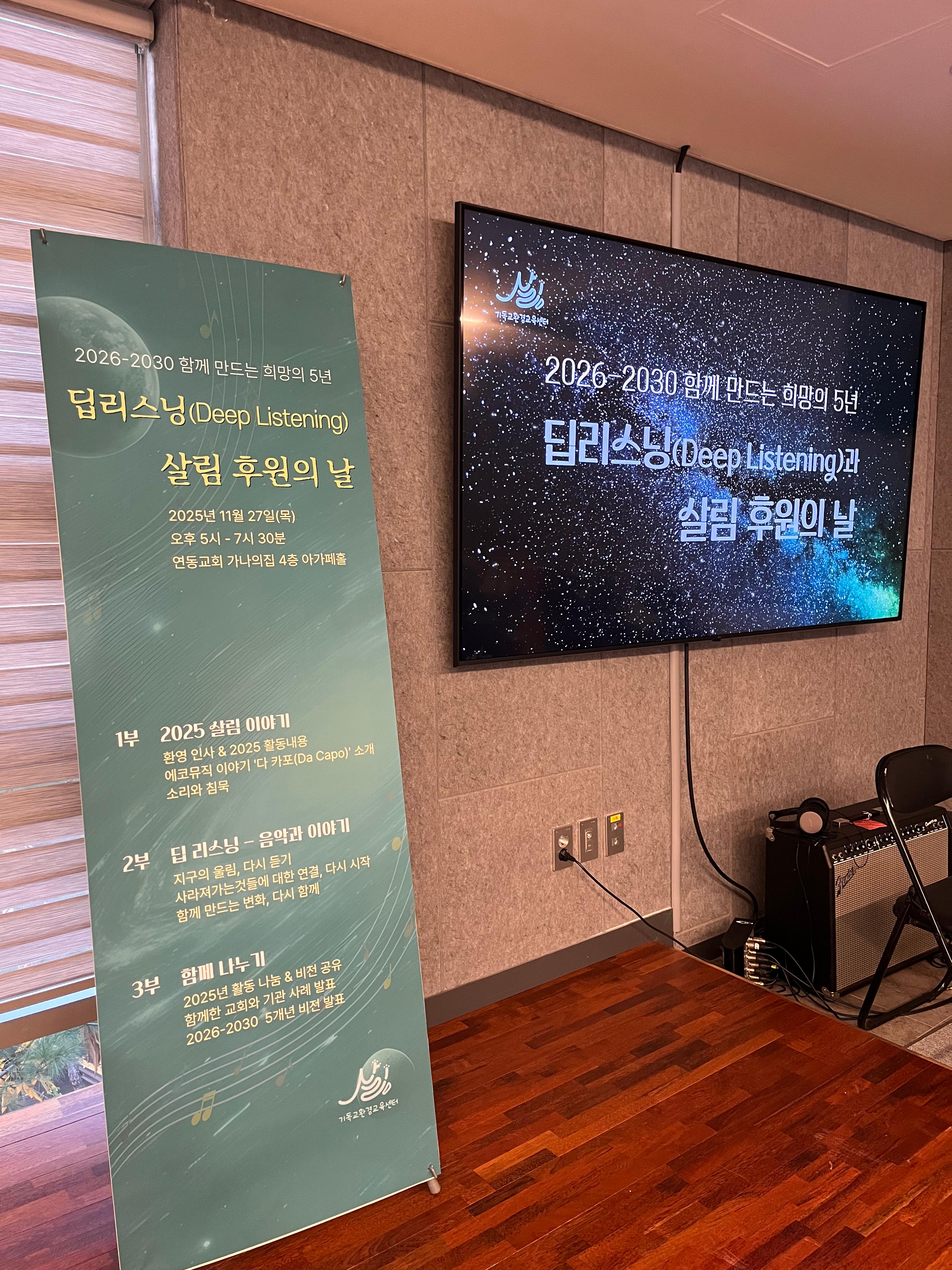 2025년 11월 27일 비오던 목요일 저녁 5시, 연동교회 가나의집 4층 아가페홀. 창밖으로는 이미 어둠이 내리기 시작했지만, 홀 안은 따뜻한 불빛과 사람들의 온기로 가득했다. 기독교환경교육센터 살림이 마련한 '딥 리스닝과 살림 후원의 날' 행사에 참석하기 위해 한 해 동안 살림과 함께한 교회, 기관, 후원자들이 하나둘 모여들었다.