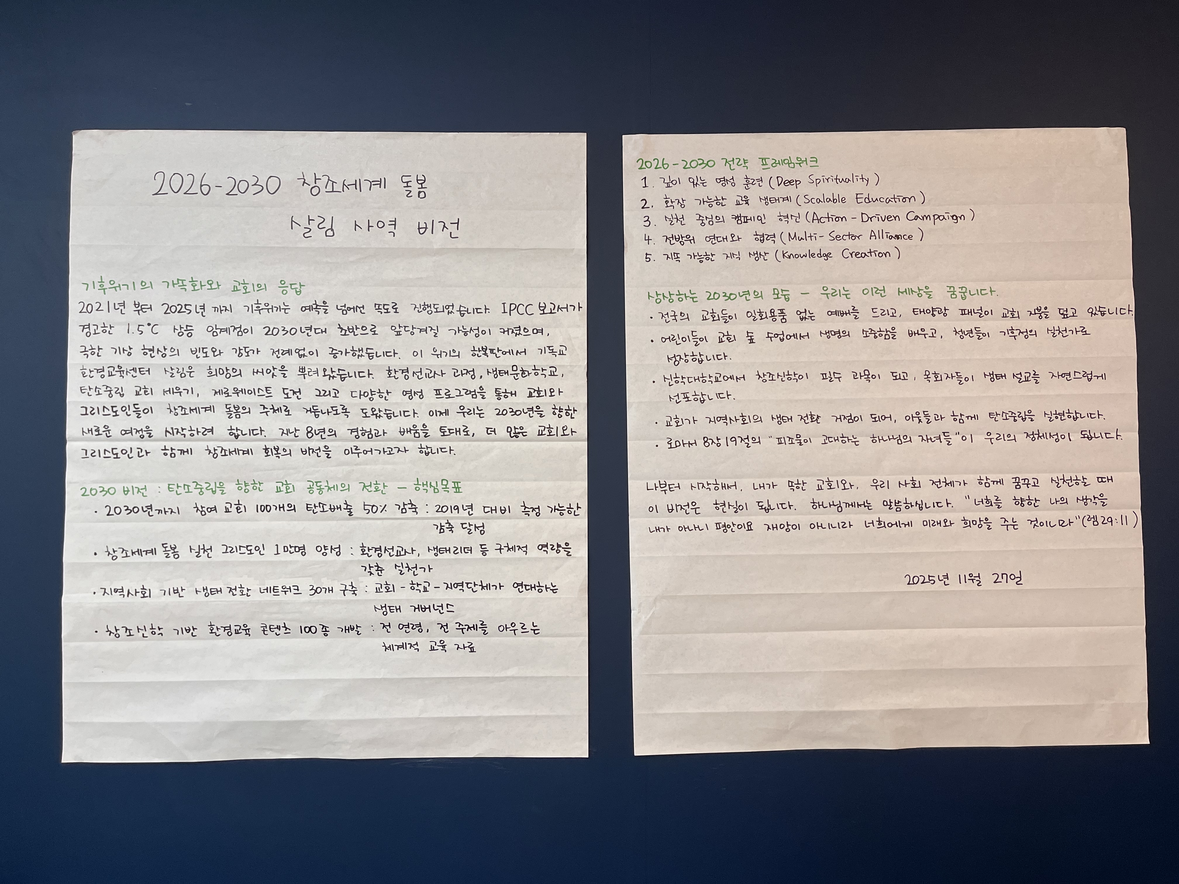 그리고 우리는 함께 '2026-2030 창조세계 돌봄 약속서'에 서명했습니다. 이것은 단순한 계획이 아니라, 여러분 한 분 한 분을 향한 초대입니다. 앞으로 5년 동안 환경선교사 양성, 교회 생태교육, 창조영성 리트릿, 플라스틱 해방여정, 탄소중립 캠페인을 함께 만들어가는 여정입니다.