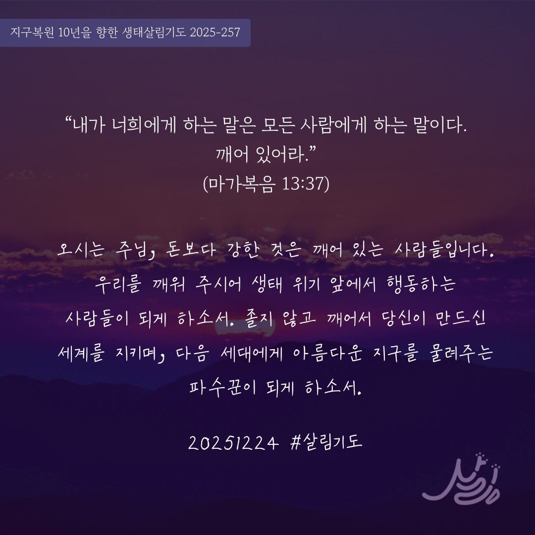 오시는 주님, 돈보다 강한 것은 깨어 있는 사람들입니다. 우리를 깨워 주시어 생태 위기 앞에서 행동하는 사람들이 되게 하소서. 졸지 않고 깨어서 당신이 만드신 세계를 지키며, 다음 세대에게 아름다운 지구를 물려주는 파수꾼이 되게 하소서.