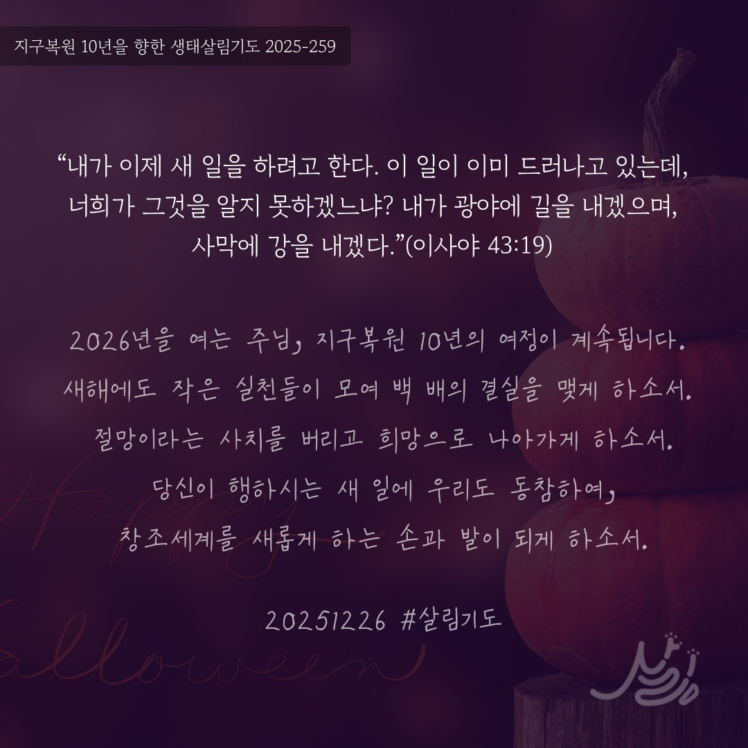 2026년을 여는 주님, 지구복원 10년의 여정이 계속됩니다. 새해에도 작은 실천들이 모여 백 배의 결실을 맺게 하소서. 절망이라는 사치를 버리고 희망으로 나아가게 하소서. 당신이 행하시는 새 일에 우리도 동참하여, 창조세계를 새롭게 하는 손과 발이 되게 하소서.