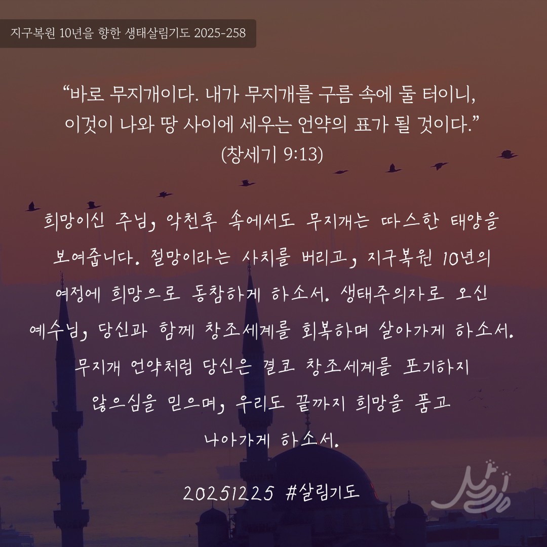 희망이신 주님, 악천후 속에서도 무지개는 따스한 태양을 보여줍니다. 절망이라는 사치를 버리고, 지구복원 10년의 여정에 희망으로 동참하게 하소서. 생태주의자로 오신 예수님, 당신과 함께 창조세계를 회복하며 살아가게 하소서. 무지개 언약처럼 당신은 결코 창조세계를 포기하지 않으심을 믿으며, 우리도 끝까지 희망을 품고 나아가게 하소서. 아멘.