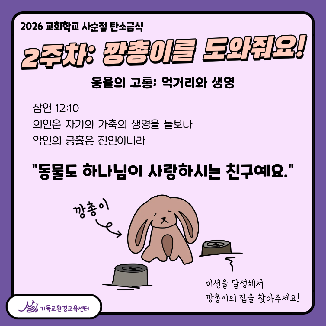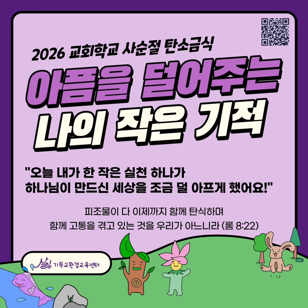 2026 사순절 탄소금식의 주제는 ‘십자가 아래, 생명와 함께’를 주제로 하나님의 피조물의 고통에 공감하며 기도하고 실천합니다. 사순절 탄소금식 묵상실천 캠페인 온라인 카드를 나눔받으실