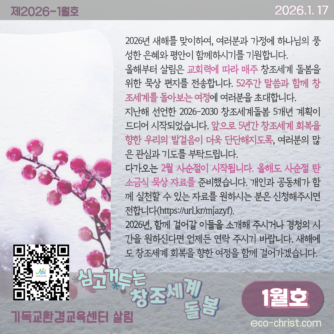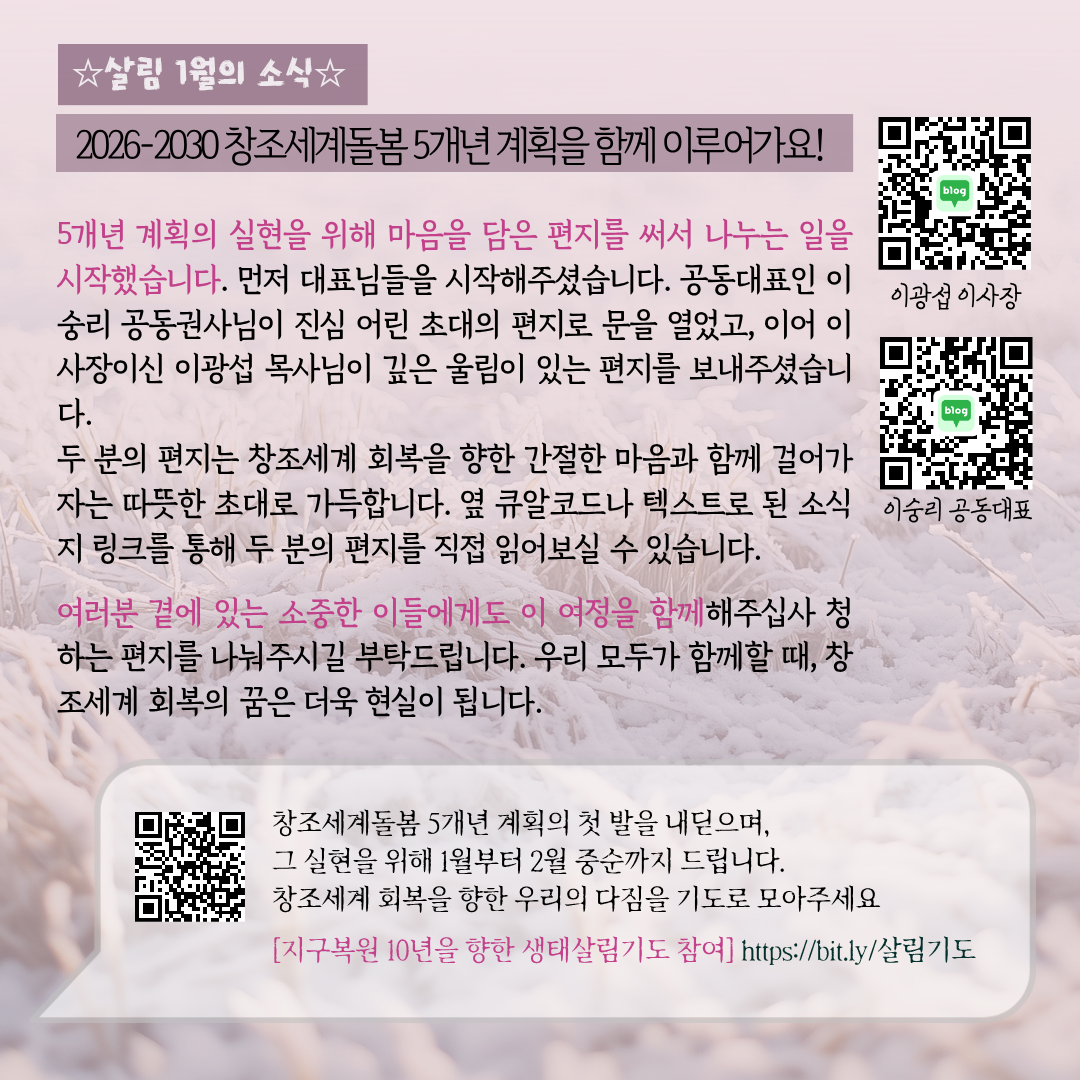 새해에도 창조세계 회복을 향한 여정을 함께 걸어가겠습니다.