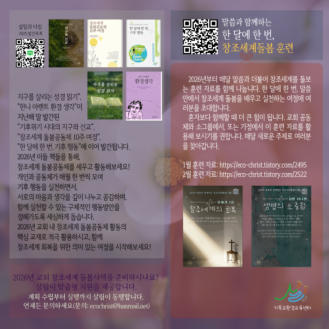 2026년부터 매달 말씀과 더불어 창조세계를 돌보는 훈련 자료를 함께 나눕니다.