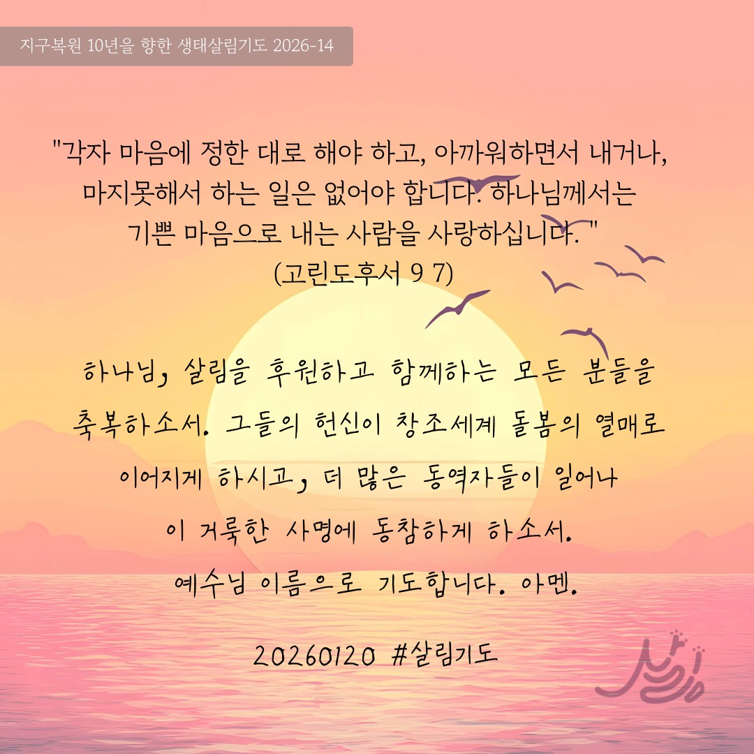 하나님, 살림을 후원하고 함께하는 모든 분들을 축복하소서. 그들의 헌신이 창조세계 돌봄의 열매로 이어지게 하시고, 더 많은 동역자들이 일어나 이 거룩한 사명에 동참하게 하소서. 예수님 이름으로 기도합니다. 아멘.