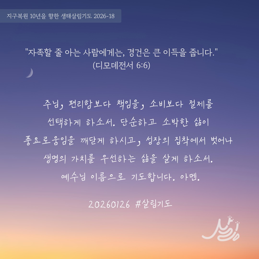 주님, 편리함보다 책임을, 소비보다 절제를 선택하게 하소서. 단순하고 소박한 삶이 풍요로움임을 깨닫게 하시고, 성장의 집착에서 벗어나 생명의 가치를 우선하는 삶을 살게 하소서. 예수님 이름으로 기도합니다. 아멘.