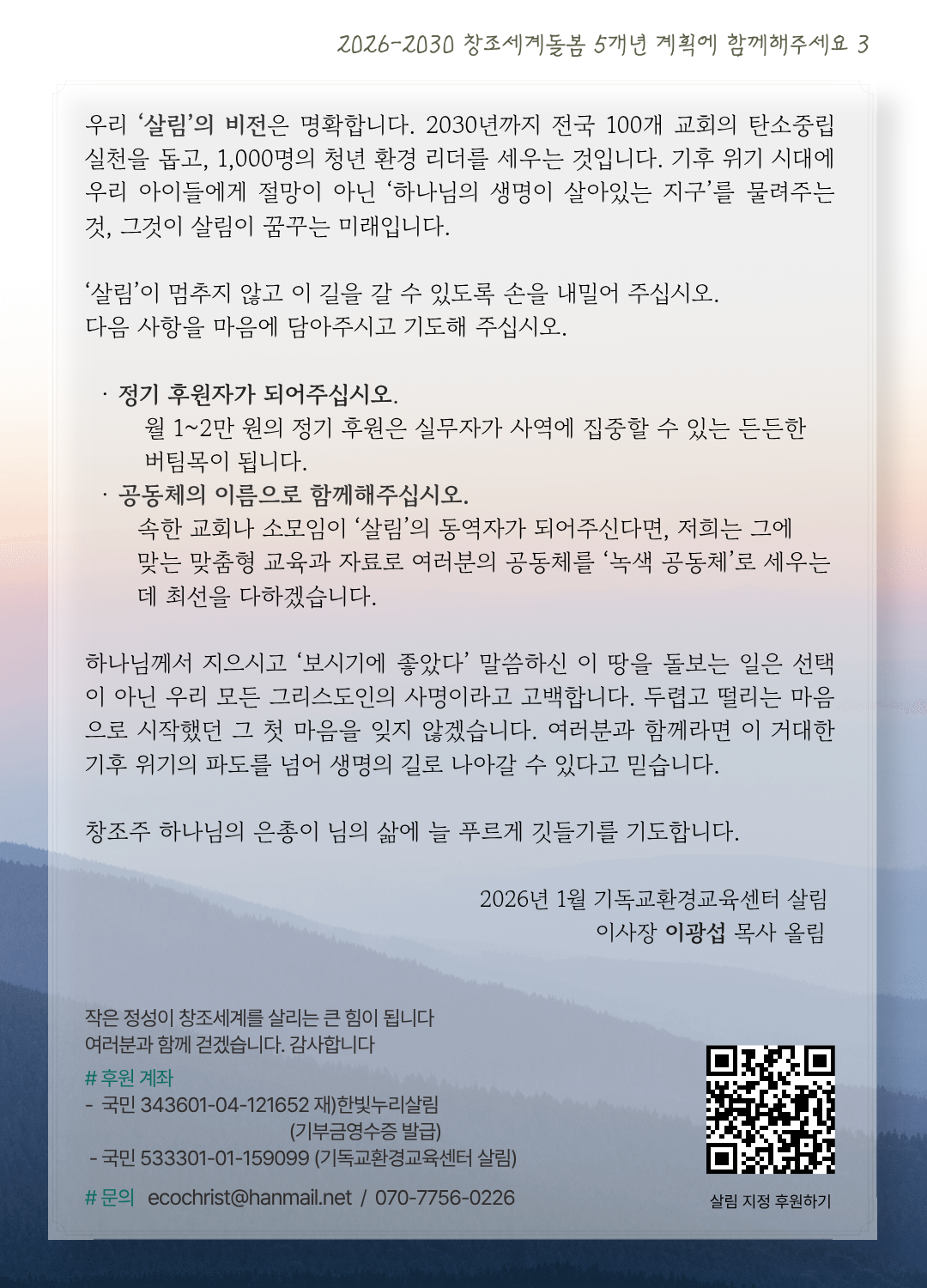 | 2026-2030 창조세계돌봄 5개년 계획에 함께해주세요(이숭리 공동대표) (1) | 2025.12.19 |
