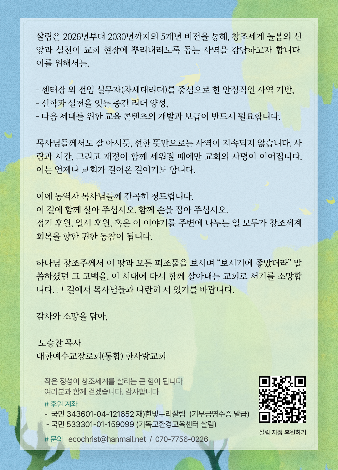 | 2026-2030 창조세계돌봄 5개년 계획에 함께해주세요(이숭리 공동대표) (1) | 2025.12.19 |