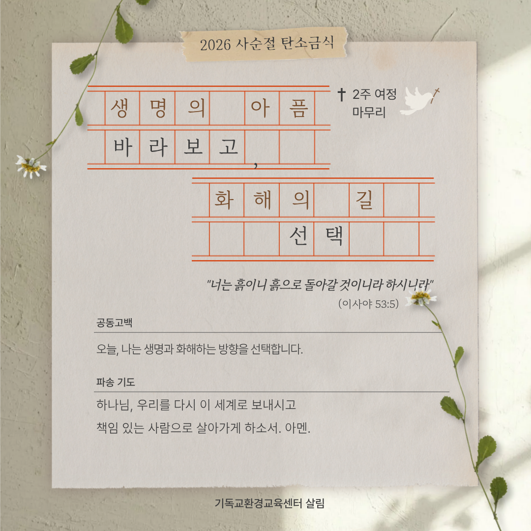 2026 사순절 탄소금식 십자가 아래, 생명과 함께- 십자가의 고난과 피조물의 신음을 함께 묵상하는 7주간의 영적 순례 기독교환경교육센터 살림이 2019년부터 이어온 사순절 탄소금식 캠페인이2026