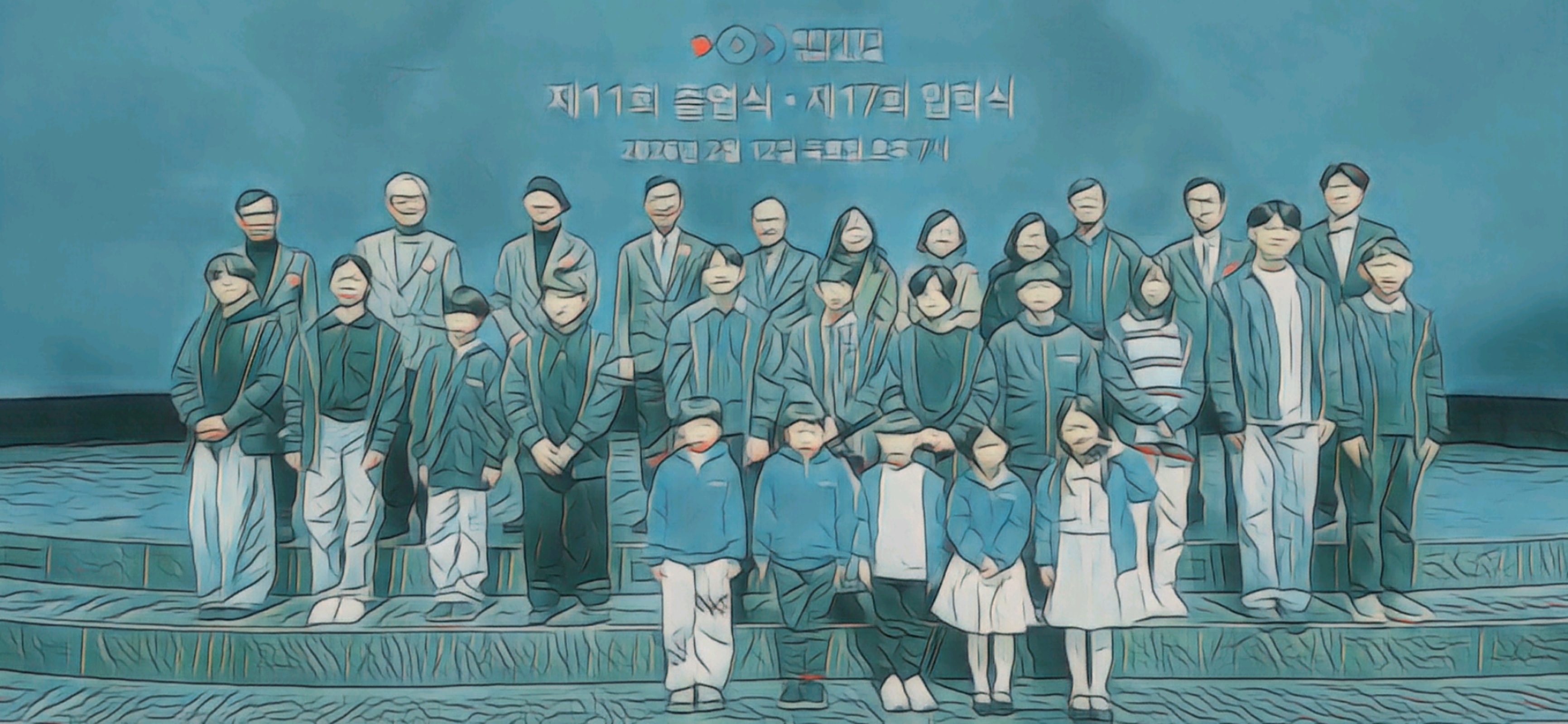 행사의 마지막, 기념촬영을 하며 아이들의 얼굴을 다시 바라보았다. 떠나는 아이들과 시작하는 아이들이 한 무대 위에 서 있는 장면 - 한 공동체가 함께 시간을 건너는 모습이었다. 배움이 지식으로 끝나지 않고 더 삶으로 이어지기를, 자연을 사랑하는 마음이 신앙의 결로 더 크게 자라나기를, 그리고 작은 학교에서 시작된 이야기가 세상 속에서 더 큰 이야기로 이어지기를 기도한다.🌿