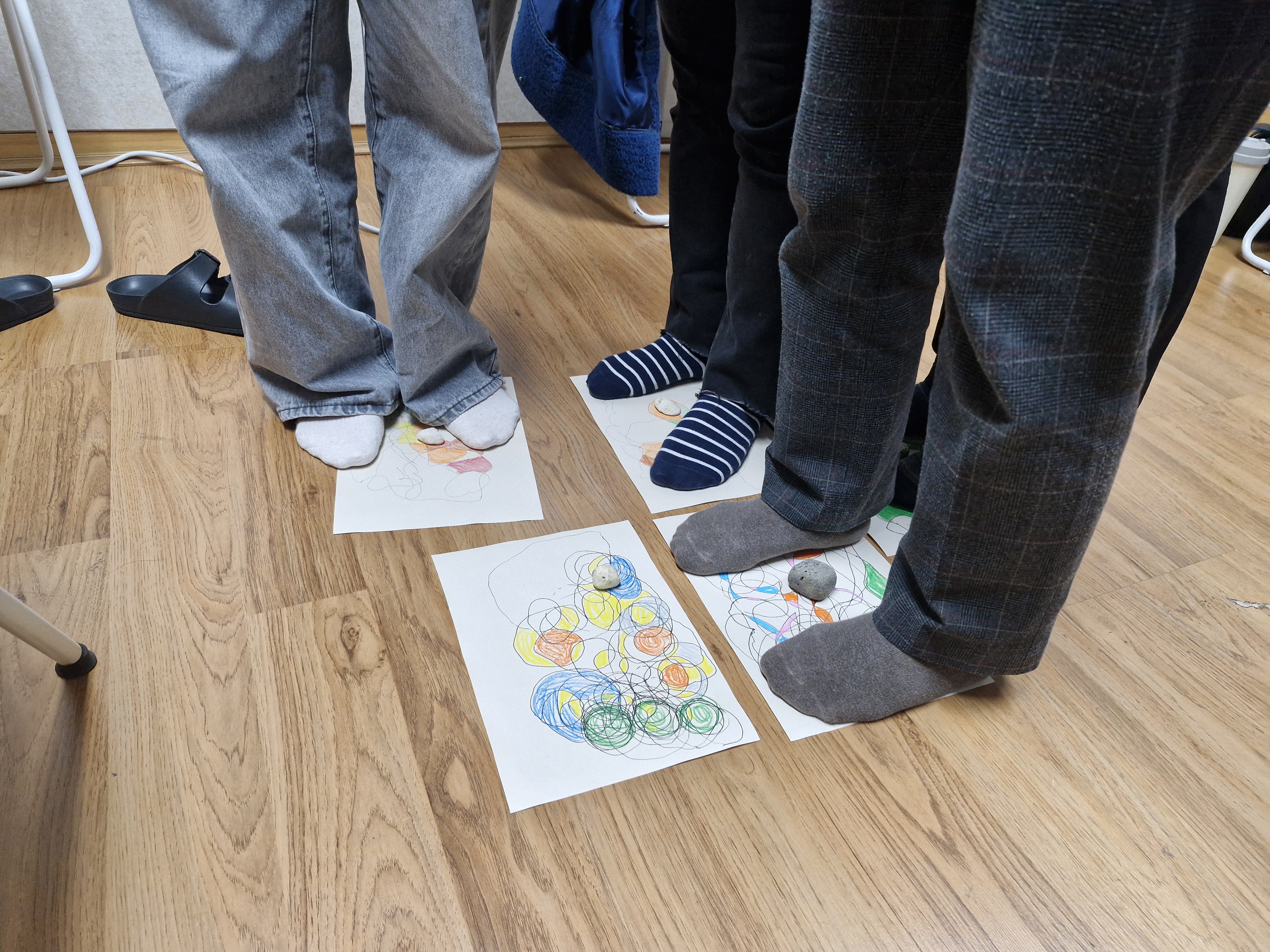 참여자들은 도시에서 주워온 돌 하나를 A4 용지 위에 올리고, 펜을 대고 천천히 굴리며 선을 그렸다. 돌이 만든 궤적을 채색한 뒤, 종이를 바닥에 놓고 그 위에 올라섰다. 그리고 질문이 던져졌다.