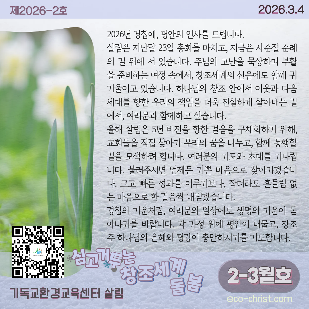2026년 교회 창조세계 돌봄사역을 준비하시나요? 살림이 맞춤형 지원을 제공합니다.