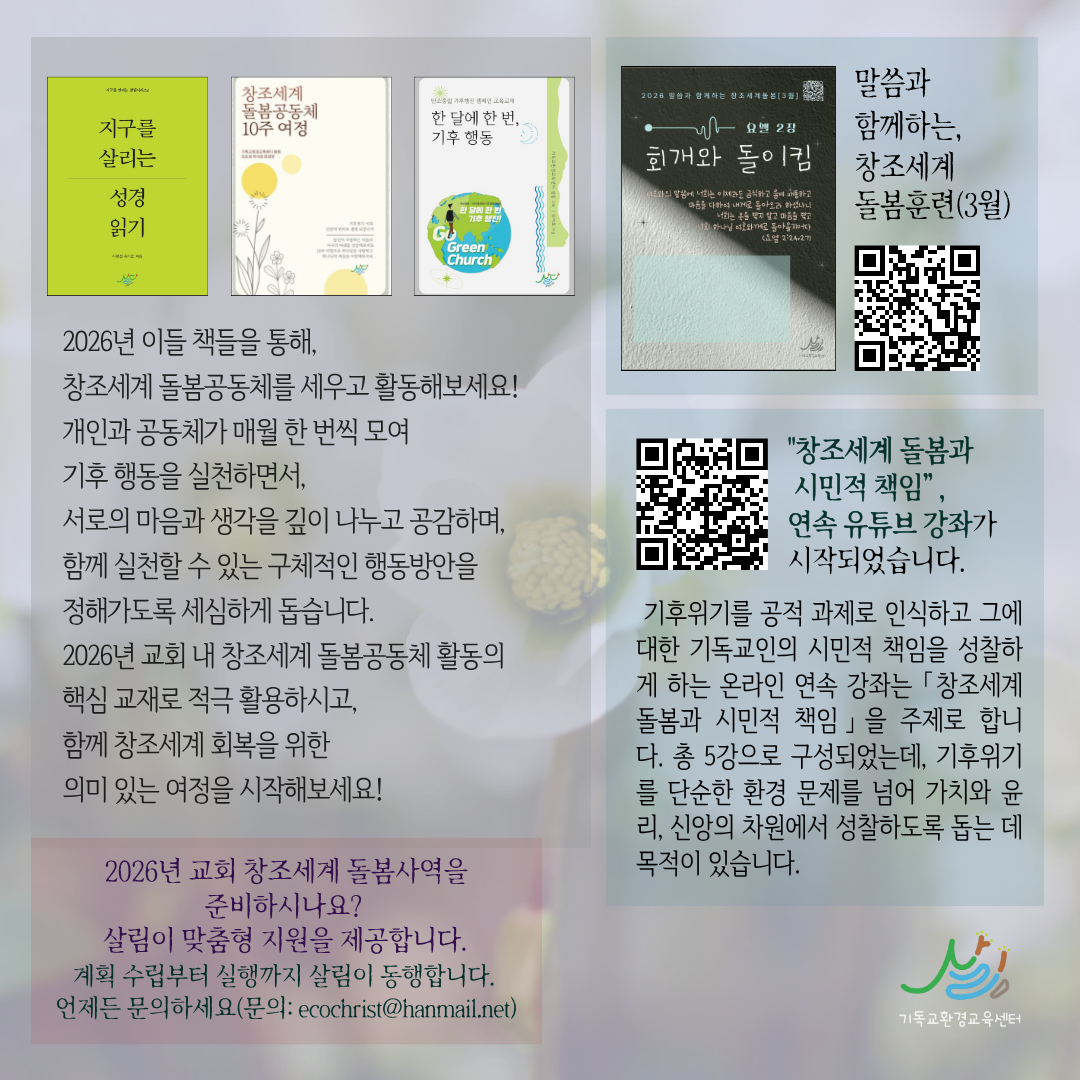 2026년 교회 내 창조세계 돌봄공동체 활동의 핵심 교재로 적극 활용하시고,