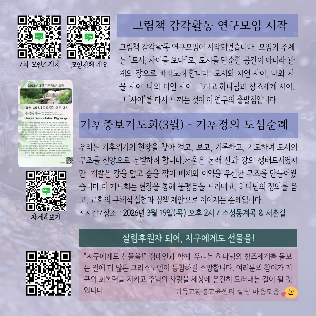 우리는 기후위기의 현장을 찾아 걷고, 보고, 기록하고, 기도하며 도시의 구조를 신앙으로 분별하려 합니다.