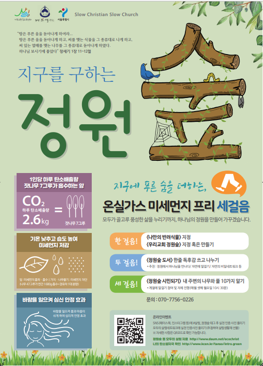 ‘교회 정원숲’으로 ‘하나님의 정원’을 회복하는 꿈을 꾼다. 모두를 향한 사랑을 실천하는 길이자 분열된 세상을 하나로 감싸 안는 길이라 생각한다. 크기나 모양에 상관없이 교회 마당과 주차장, 벽면과 옥상, 그리고 무엇보다 교회와 세상을 오고가는 길에 정원숲을 만들어 잇는 일. 서로의 관계가 회복되고 쫓겨났던 생명들도 돌아오리라. 나비가 춤추고 새들이 노래하면, 사람만이 아닌 모든 만물이 함께 드리는 풍성한 찬양을 올려드릴 수 있으리라. 새들의 노래와 나뭇잎 사이를 스치는 바람 소리에서 하나님의 음성을 들을 수 있으리라.